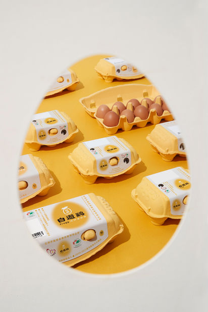 設計焦點上,雙好設計團隊在農場與產業的經營脈絡中,將蛋黃透亮的黃色、雞羽毛棕色,以及象徵自由的純淨白色作為品牌識別色,除呼應「自在悠遊」的企業精神,蛋型與輕盈羽毛的品牌識別,也緊扣《自遊雞 Fregg》蛋盒中,每顆雞蛋都從自在生活的母雞而來,「自由是一種精神,蛋型與光暈帶著一股向陽、充滿希望的動力,這是品牌的核心價值,也是整個雞蛋產業在臺灣的近程目標。」雙好設計透過孕育《自遊雞 Fregg》的企業識別與產品包裝,也反覆琢磨如何將「非籠飼」的產業趨勢,從產業與產地,帶入消費市場與你我餐桌。